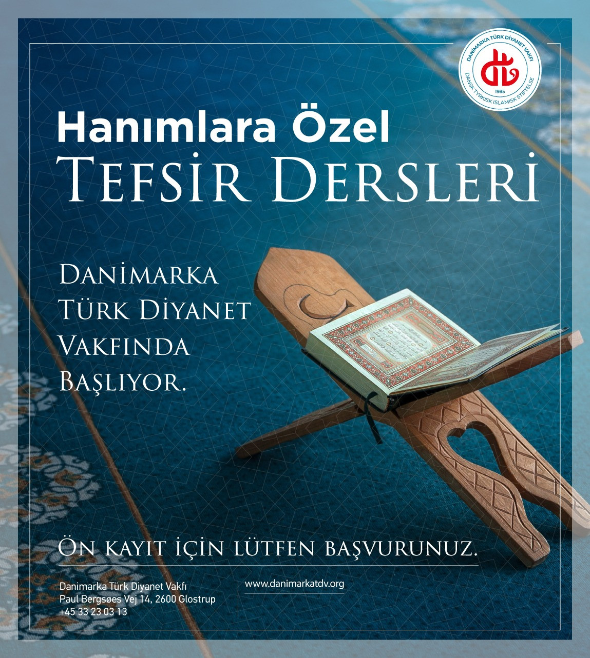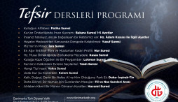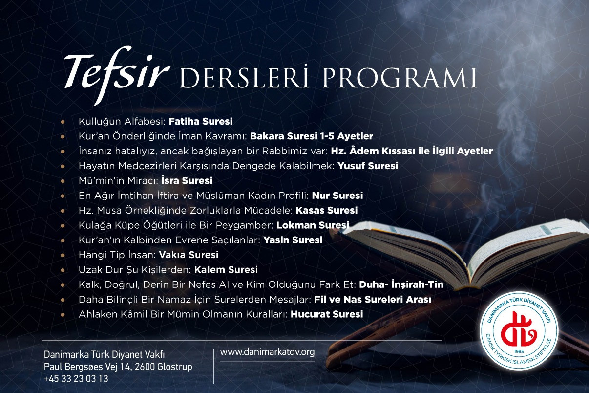 Tefsir Dersleri Salı, Çarşamba ve Perşembe günleri olmak üzere haftanın üç günü Vakıf hizmet binasında yapılacak. Fyn ve Jylland adasından gelen yoğun talep üzerinde tefsir kursunun Eylül ve Ekim aylarında Aarhus’ta yapılması planlanıyor.