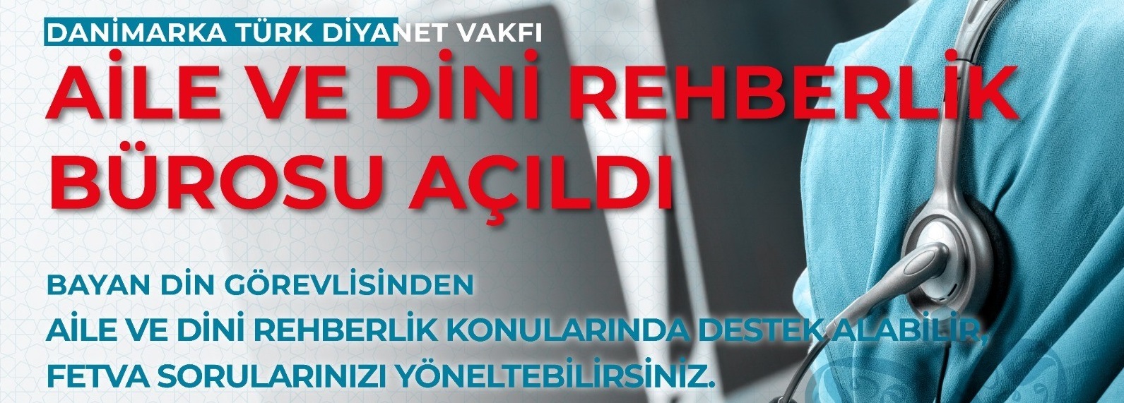 "Mutlu Bireyler Mutlu Aileleri, Mutlu Aileler ise Toplumları İnşa Eder" prensibiyle toplumun en temel yapısı olan aile birliğininin korunmasını ve aile bireyleri arasındaki iletişimin güçlenmesini önemsiyoruz. Danimarka'da yaşayan ailelere yukarıda belirtilen amaçla Vakfımız bünyesinde Aile ve Dini Rehberlik Bürosu açılmıştır. Alanında uzman din görevlileri görev yaptığı bu büroda dini soruları cevaplanmakta ve aile konularında danışmanlık ve rehberlik yapılmaktadır. Hafta için her gün 09.00-17.00 saatleri arasında hizmet verecek olan büroya 0045 43 20 10 51 nolu telefondan ulaşabilir. Vakıf tarafından verilen bu hizmetten faydalanabilir, aile ve dini konularda destek alabilirsiniz.